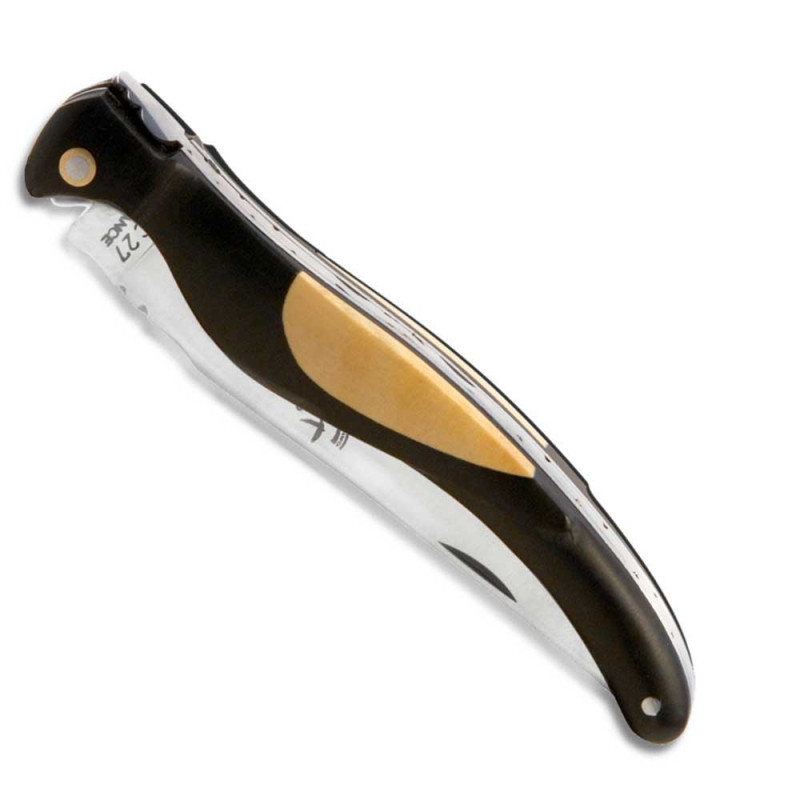 The ergonomic handle is shaped in the form of a bird’s wing. The boxwood’s inlay imitates the bird’s plumage. It houses the sharpened blade of the laguiole knife.