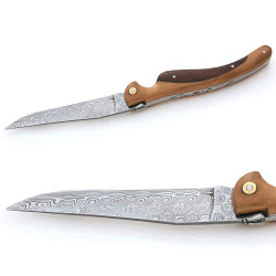 Avec ce modèle à la lame damassée, vous avez la quintessence du savoir-faire coutelier au creux de la paume. Le damas, ce procédé de feuilletage de l’acier si exigeant au rendu unique, ce mariage de matériaux entre le bois d’olivier doux et clair et le brun profond et parfumé du bois de palissandre… C’est du grand art en coutellerie!