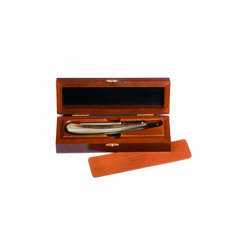 Coffret vide pour ranger 1 rasoir droit. Un coussinet de protection en cuir, amovible, protège le rasoir.